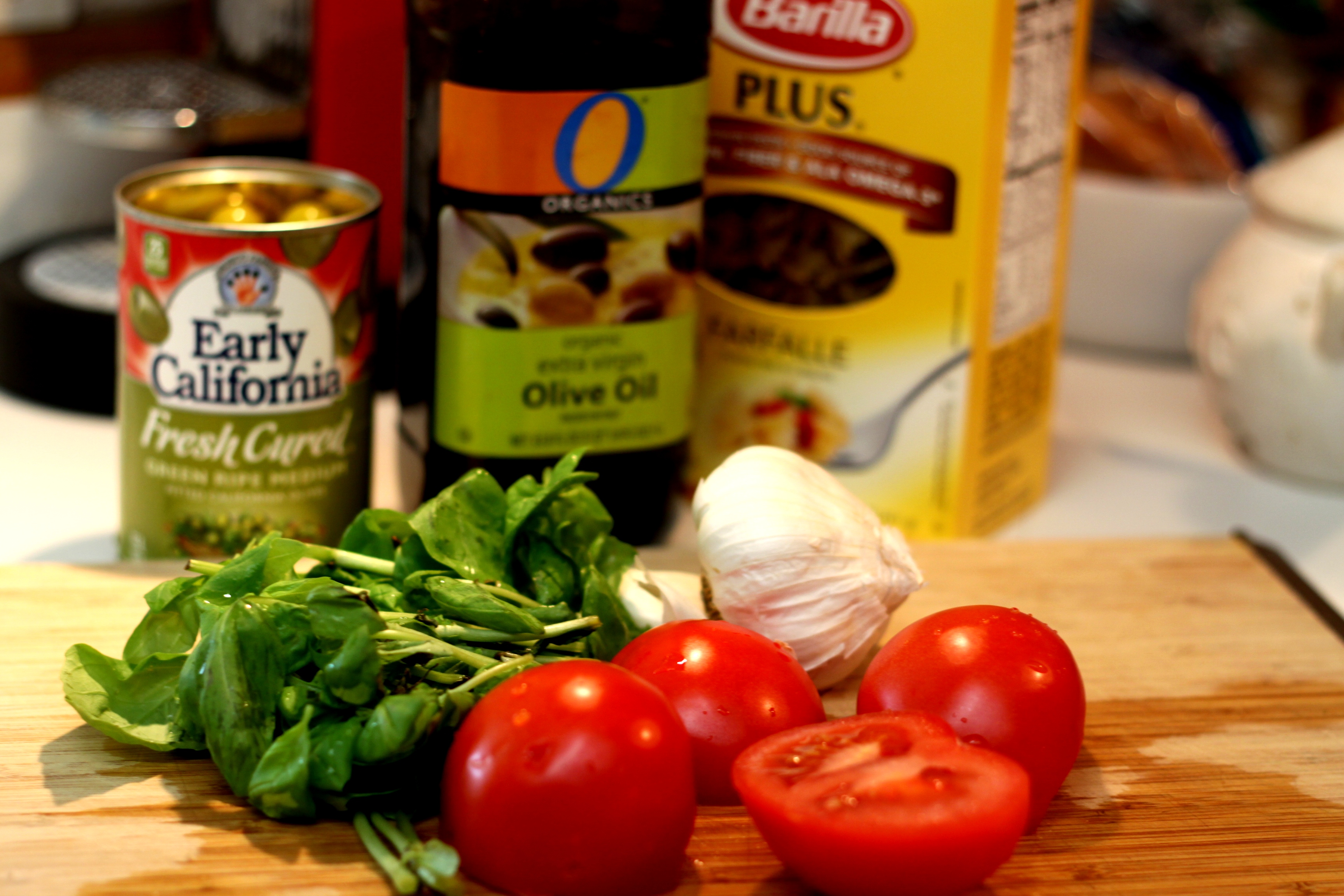 2. While the pasta is cooking place basil leaves, olive oil and garlic cloves in a food processor and blend. Add 1 can of olives to the food processor and pulse 2 or 3 times. Add tomatoes and pulse once (or not at all depending on how lazy you were feeling when you chopped them… I was lazy and didn’t chop them enough so I had the processor help me), be sure not to over-pulse the tomatoes or else you will end up with a watery pesto.