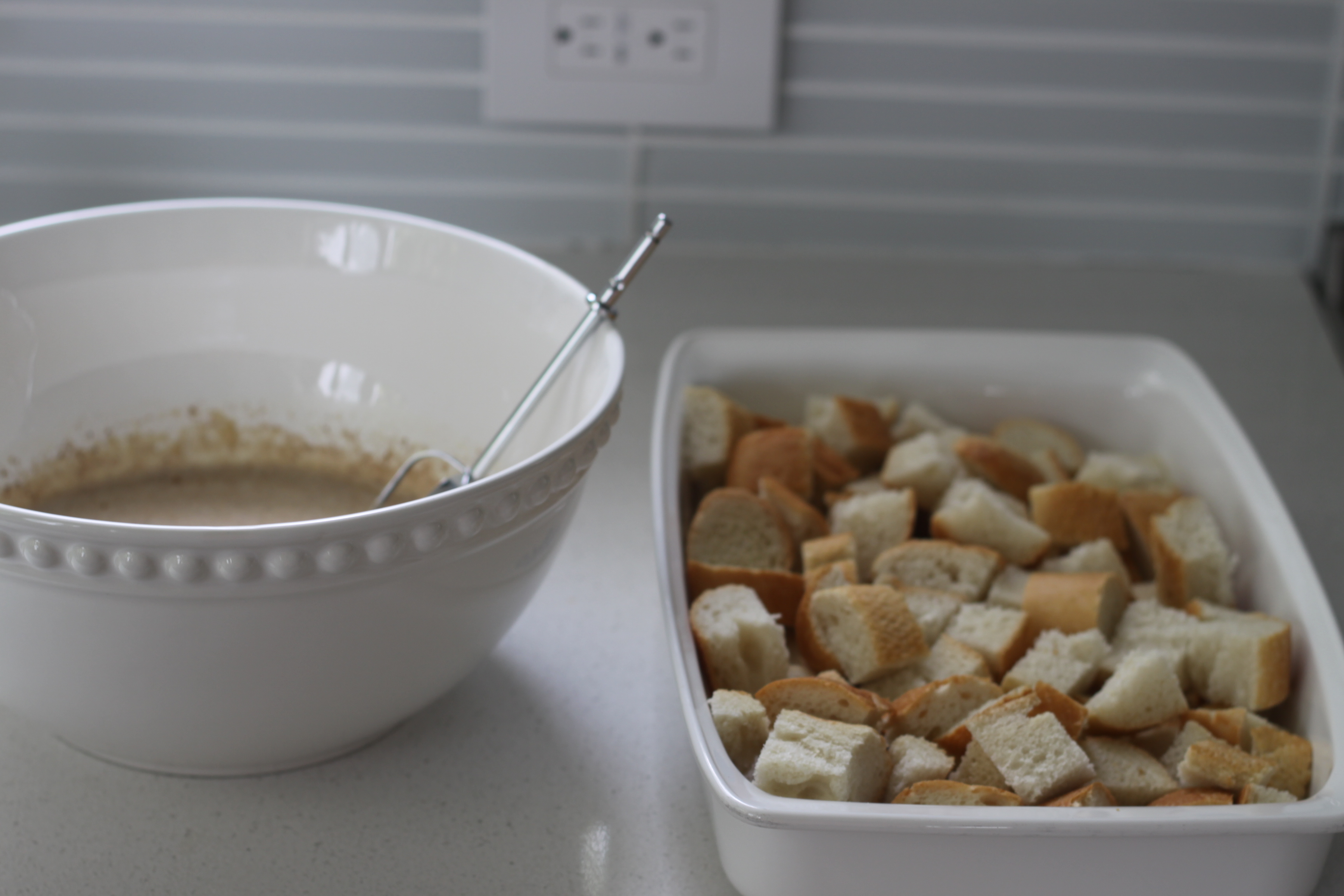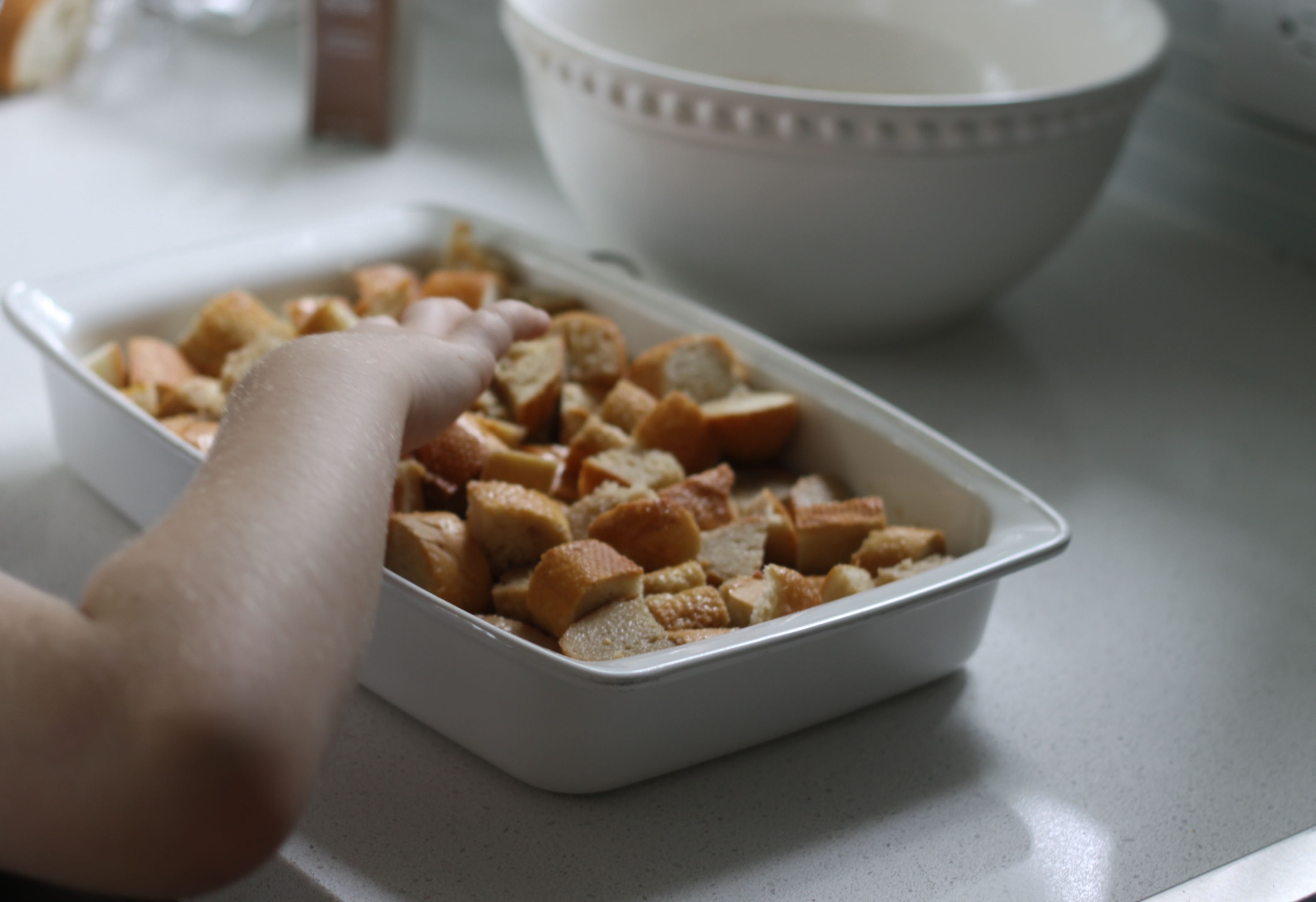 Place cubed bread in a baking dish (any size will do)