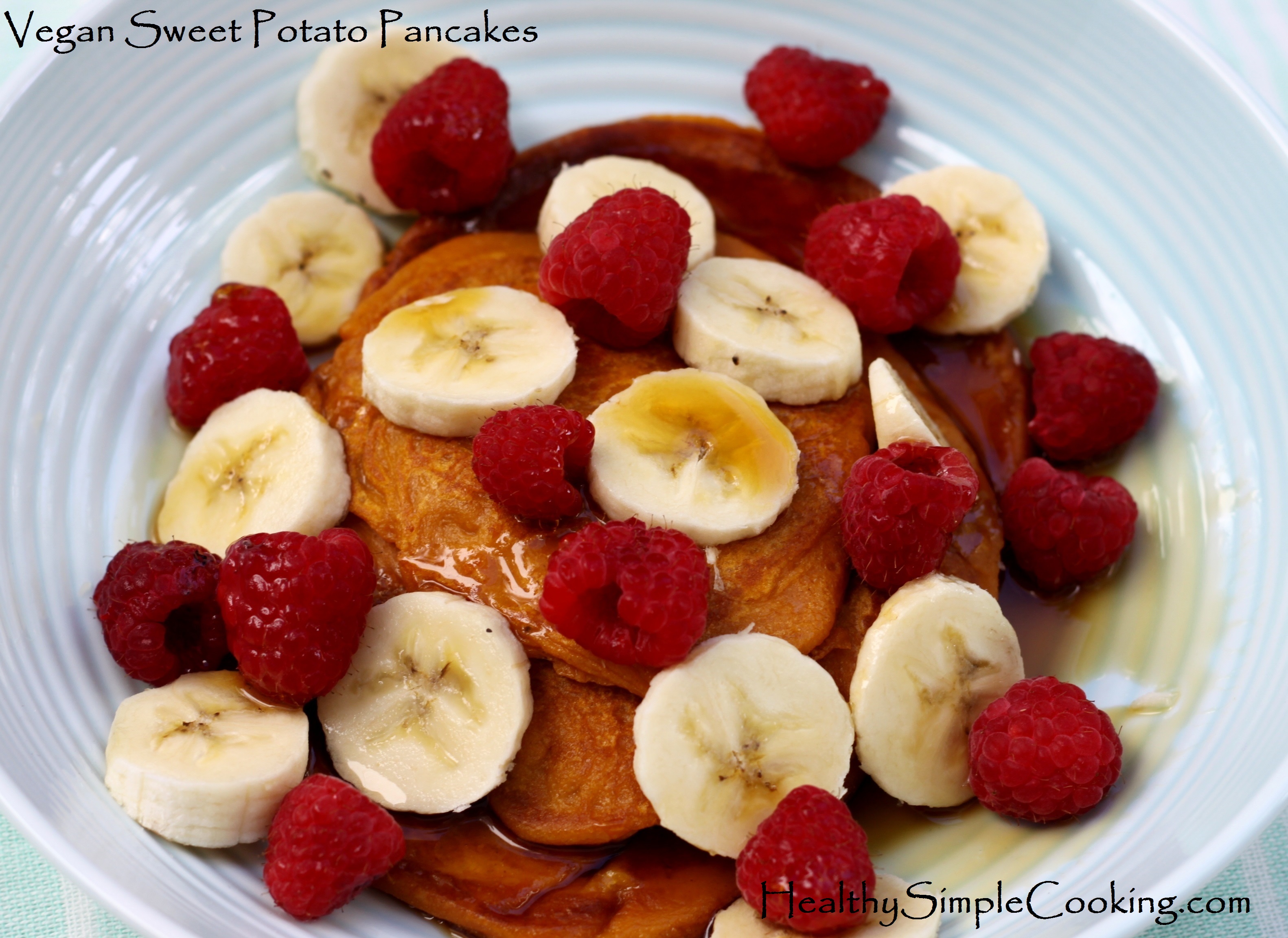 DIRECTIONS: Peel and cube the sweet potato. Steam for 15 minutes or until a fork can easily puncture the sweet potato. In a food processor combine steamed sweet potato, dairy-free milk, flour, honey and cinnamon for about 1 minute or until very smooth. Heat a non-stick pan and 1 tsp. coconut oil. Once the pan is very hot place 2 tablespoons of the pancake batter onto it and shape with your spoon. Cook for 3 minutes, then flip. Cook other side for about 4 minutes. Repeat these steps until all the batter is used up. Top pancakes with your favorite fruit and maple syrup. Enjoy 🙂