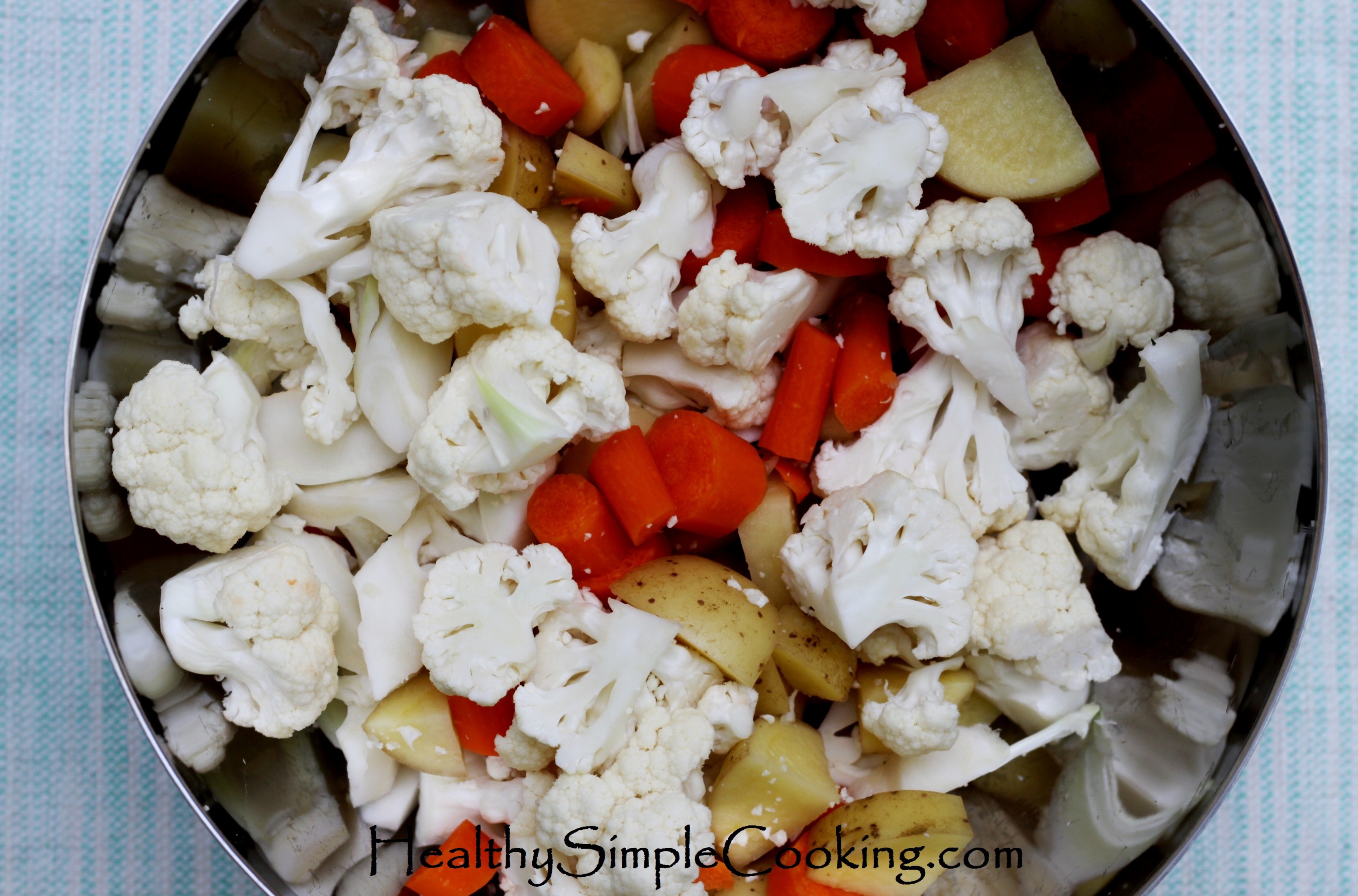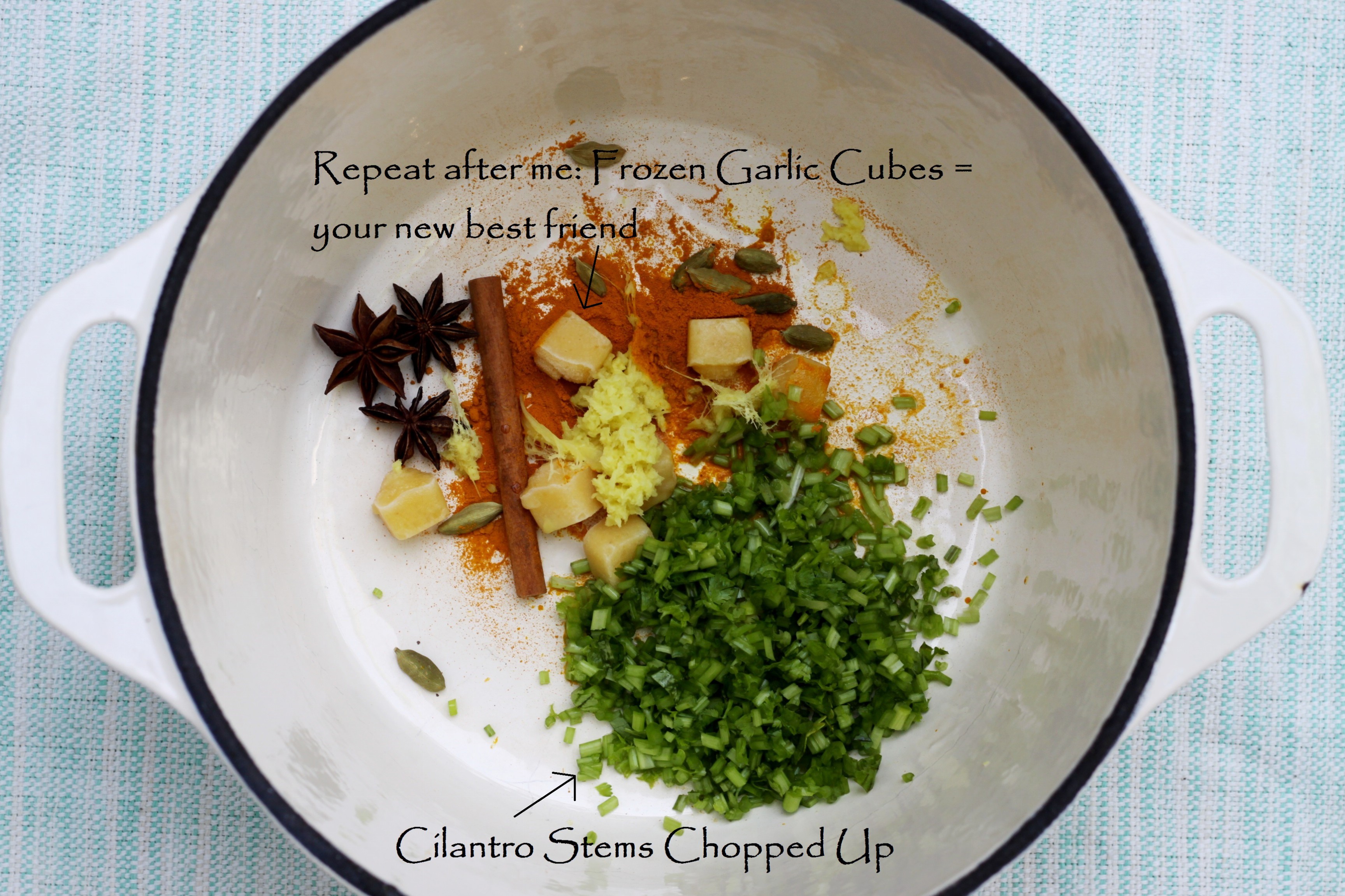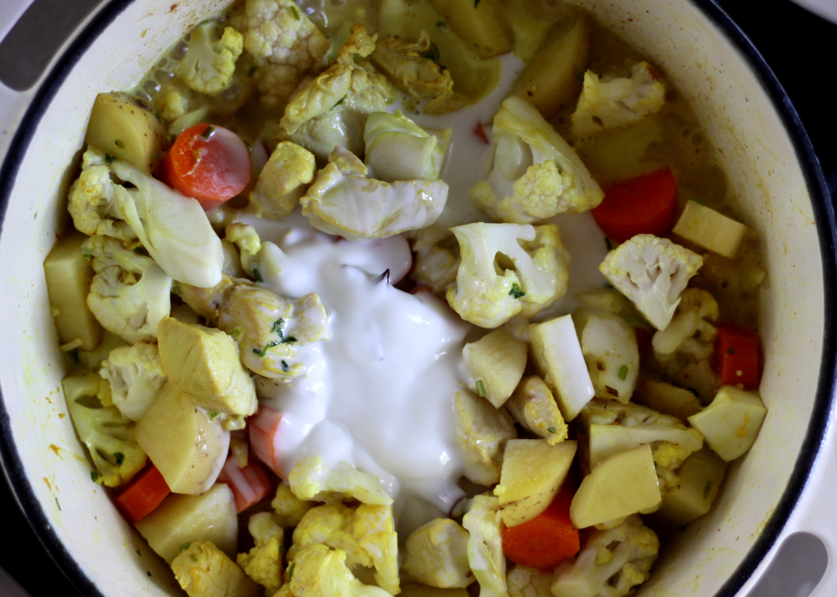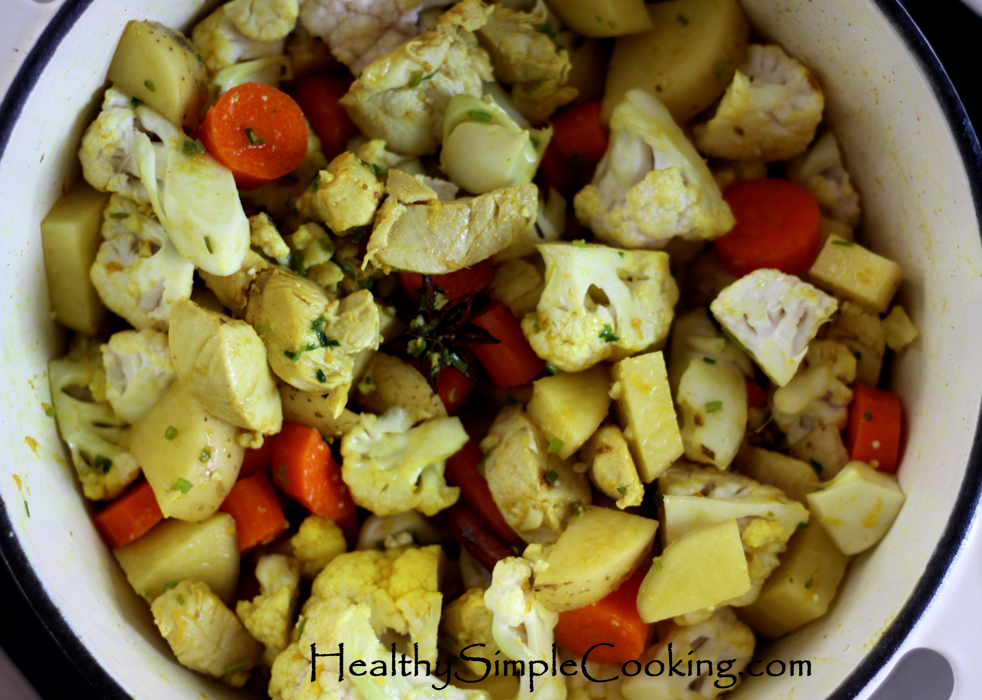 Heat 1 tbsp of butter or oil in a non-stick frying pan over medium-high heat. Add chicken and brown for 5 mintues on each side. Take chicken off of heat and set aside. In a cast iron pot heat 1 tbsp of butter or oil over medium heat. Add all Cardamom, Anise, Ginger, Garlic, Cilantro Stems and Tumeric Root. Saute for about 5 minutes. Add the chicken. Saute for 2 minutes and then deglaze the pan by adding 1/2 cup of chicken broth. Next, Add the cauliflower, potato’s and carrots to the pot and saute for 5 minutes. Add 1 1/2 cups of chicken broth and 1 can of coconut cream. Simmer on low for 1 hour. Serve over rice or couscous.